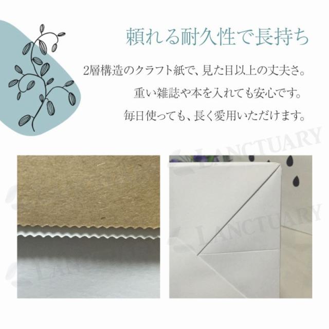 100%天然素材のクラフト紙を使用しており、環境に優しくリサイクルも可能です。軽くて丈夫なので、持ち運びも楽々。おもちゃや衣類、雑誌など、様々なものを収納できます。