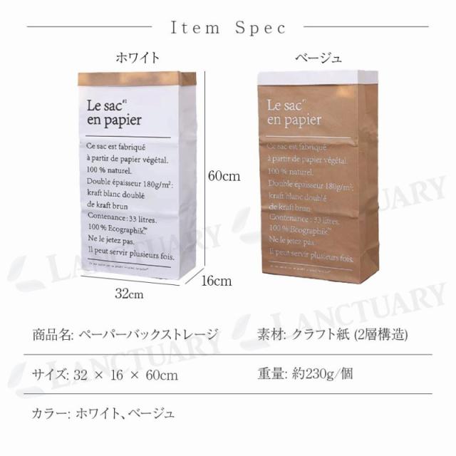 | 主な仕様 | 商品名:ペーパーバックストレージ 素材:クラフト紙 (2層構造) サイズ:32 × 16 × 60cm 重量:約230g/個 カラー:ホワイト、ベージュ |