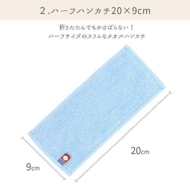 小さめでコンパクトな20cm×20cmハンドタオルと、20cm×9cmのハーフハンカチです。