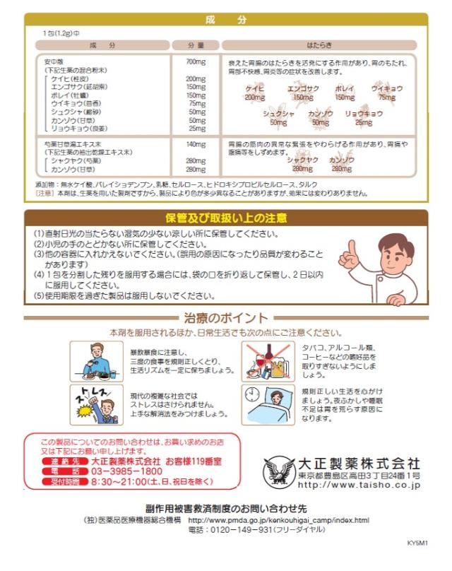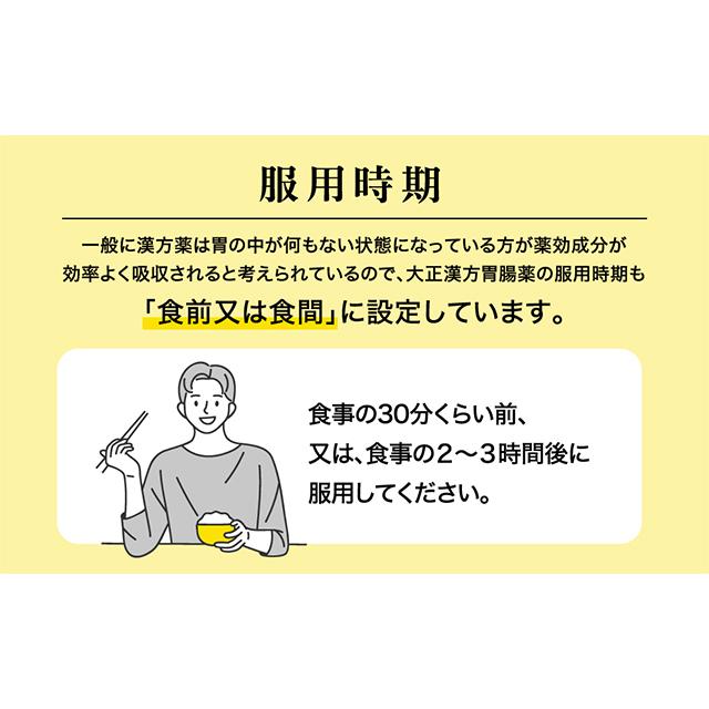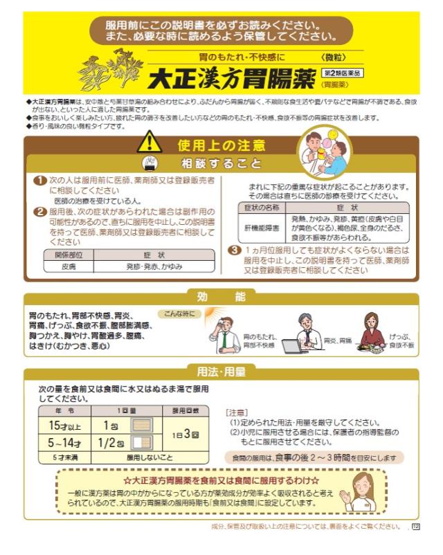 商品名 第2類医薬品 大正漢方胃腸薬48包 2個セット 大正製薬 容量 48包×2個 メーカー 大正製薬 カテゴリー 医療・介護・医薬品>医薬品>漢方薬>漢方薬【第一・二類医薬品(指定第二医薬品含む)】 効果・効能 胃のもたれ、胃部不快感、胃炎、胃痛、げっぷ、食欲不振、腹部膨満感、胸つかえ、胸やけ、胃酸過多、腹痛、はきけ(むかつき、悪心) 用法・用量 次の量を食前又は食間に水又はぬるま湯で服用してください。