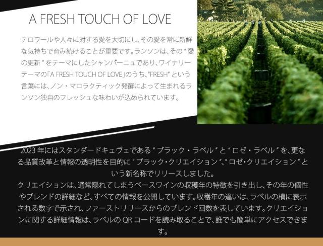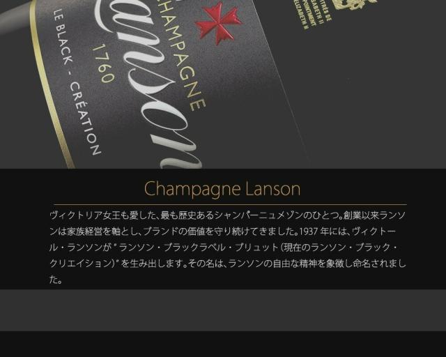 入手困難!超特大ジェロボアム(3000ml)! 伝統をまとい、ひときわ輝く、誇り高き黒! 英国王室御用達の名門!ランソン社の逸品! 新しく生まれ変わった大人気ランソン・ブラック ・クリエイション・ブリュットが遂に正規品で登場! 情報の透明性を体現する取り組みの一つとして この“クリエイション・シリーズ”として開始! キリッと引き締まった味わいエレガントな辛口! 大人気“ブラッククリエイション・ブリュット”!