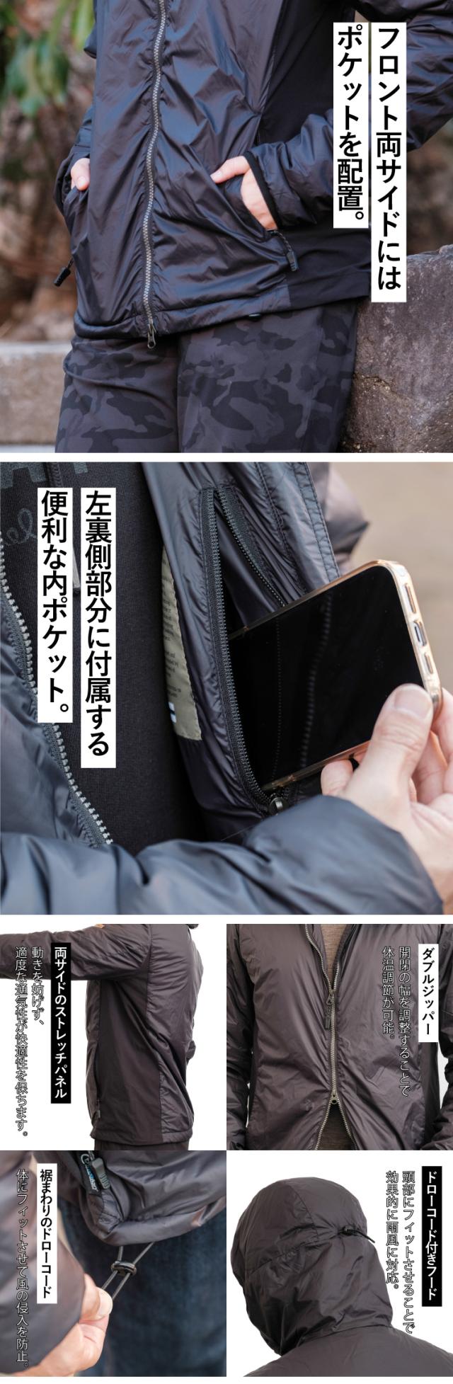 | 素材 | 表地:リサイクル・ナイロン100 裏地:リサイクル・ポリエステル100 中綿:ニューウール85%、ポリラクチド15% パネル部分:リサイクル・ポリアミド50%、ポリアミド38%、エラスタン12% |