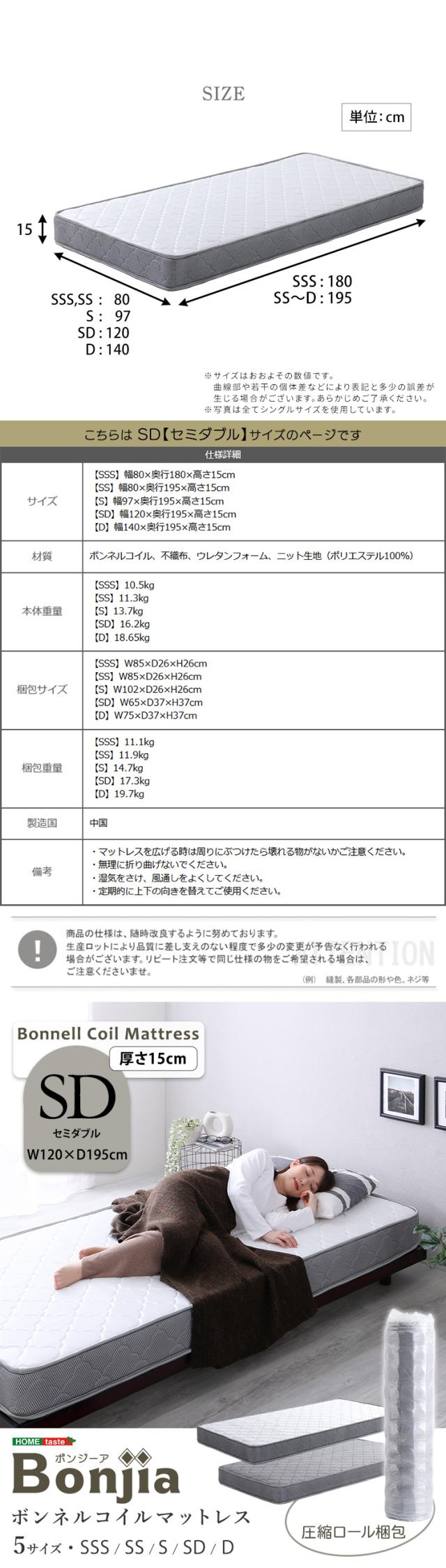 マットレス 高反発 厚さ15cm ボンネルコイルマットレス SDサイズ Bonjia(ボンジーア) 2色対応 ベッドマットレス 硬め ベッドマット おしゃれ セミダブル ボンネルコイル ウレタン シンプル 敷布団