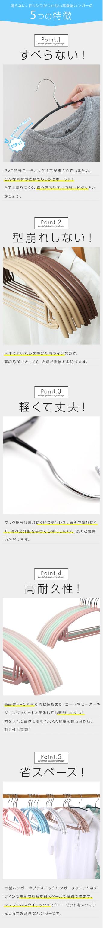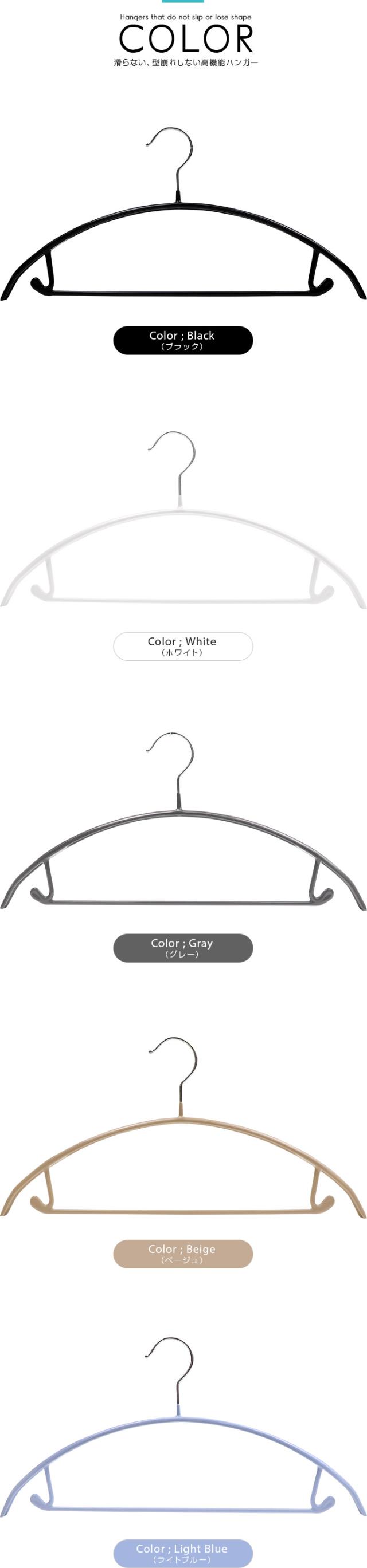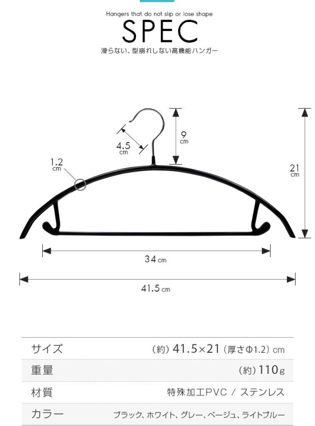 | 商品概要 | PVC特殊コーティング加工ですべりにくく、型崩れしにくいフック&バー付きのハンガー。