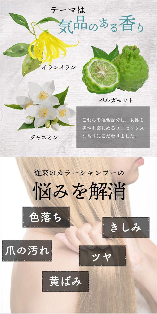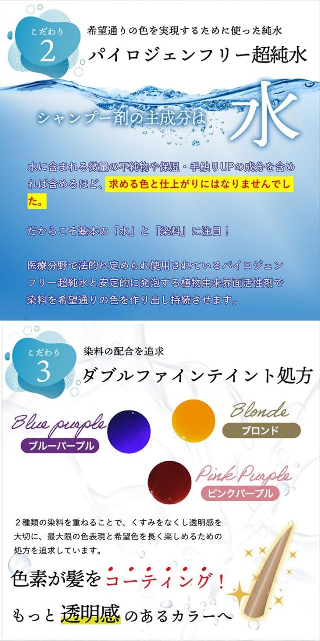 ミニマリズム処方 求める色を追求するため、調整剤を必要最小限にすることで、カラーシャンプーとしての表現を最大限まで引き上げました。