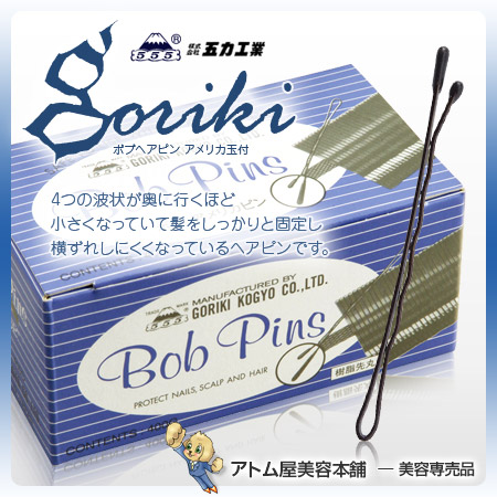 五力工業の定番ヘアピン”ボブヘアピン アメリカ玉付 400g”です。4つの波状が奥に行くほど小さくなっていて髪をしっかりと固定し横ずれしにくくなっています。