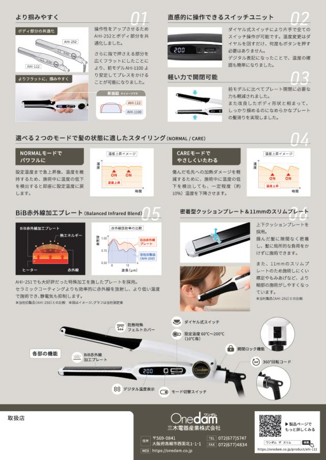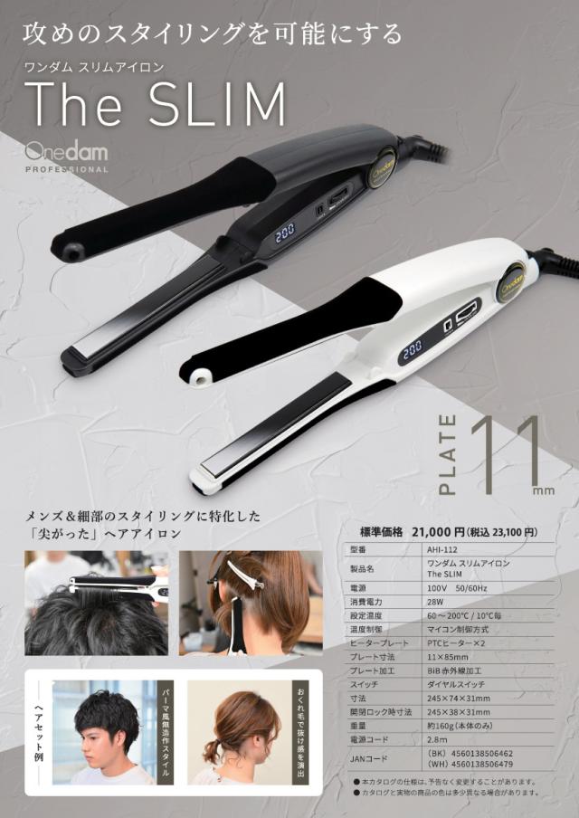 ワンダム スリムアイロン AHI-112(ブラック/ホワイト)ヘアアイロン ヘアーアイロン 赤外線加工プレート コテ 細部 パーマ風 無造作スタイル ナチュラル 抜け感 業務用 プロ用 プロ仕様 美容専売 サロン専売 美容室 理容室 美容師 サロン Onedam AHI-1100後継機
