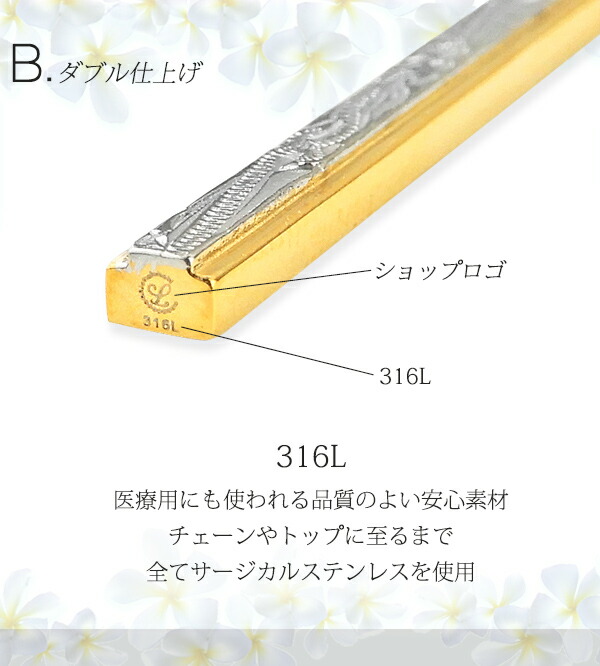 | コメント | 留め具のないロングチェーンのネックレス。チェーンがメインのラリエットはシンプルでおしゃれ。ぐんと垢抜けた雰囲気を演出できます。両端にはメタルバーとアクセントにもなる選べるモチーフ(ハート・サークル・スクエア)。縦ラインを強調することができるため、スタイルアップ効果も期待できちゃいます◎アレンジの幅が広がるラリエットで普段のコーディネートを楽しんでくださいね。 今まで金属アレルギーでハワイアンジュエリーが着けれなかった方にオススメ!! サージカルステンレス使用のハワイアンジュエリー。 医療用に使われているサージカルステンレスは肌に優しく、金属アレルギーでアクセサリーをつけられない方にも安心です。シルバーアクセサリーより軽くて丈夫で変色しにくい素材です。お手入れも、柔らかい布などでサッと拭くだけいいので、とっても簡単です。 注意:お風呂や温泉で変色しにくいですが、外していただく事をおススメいたします。また、天然石や宝石・シェルがついている商品は水につけると石取れやクスミの原因になりますので水回りはできるだけ避けるようお願いします。 ※サージカルステンレス製のチェーン付です。 |