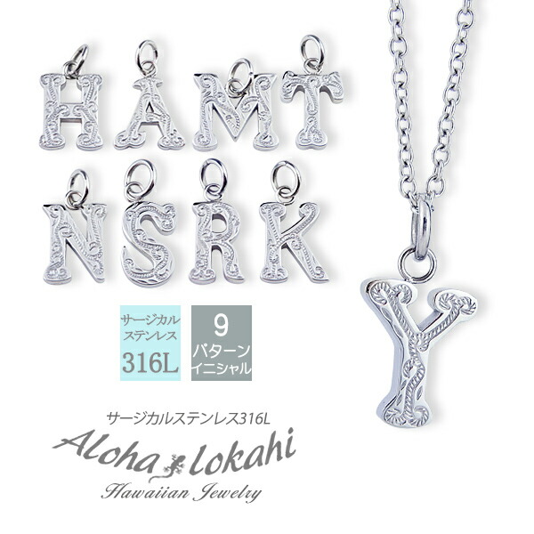 ハワイアンジュエリー ネックレス イニシャル 名前入り ペンダント シルバー スクロール ステンレス サージカルステンレス あずきチェーン アクセサリー アルファベット バレンタイン