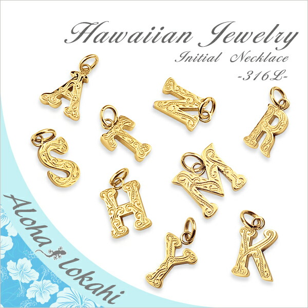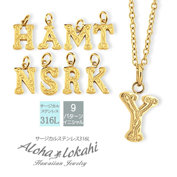 ハワイアンジュエリー ネックレス イニシャル 名前入り イエローゴールド ペンダント アルファベット スクロール ステンレス サージカルステンレス あずきチェーン アクセサリー ハワイアン バレンタイン
