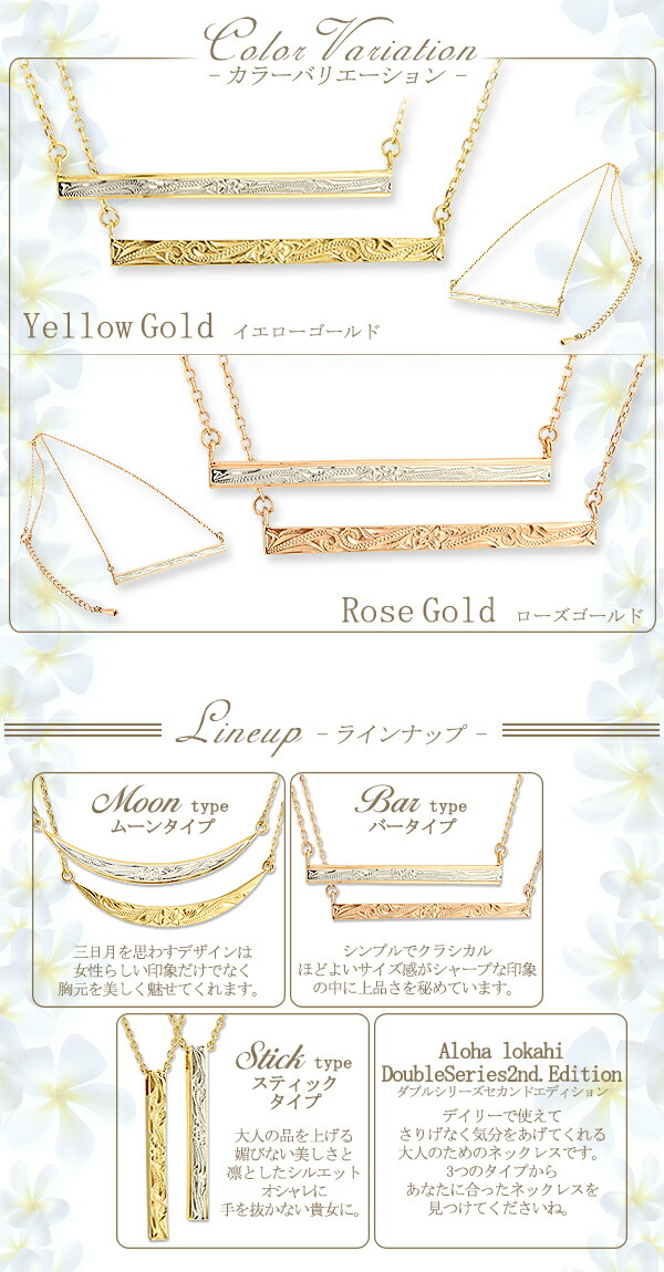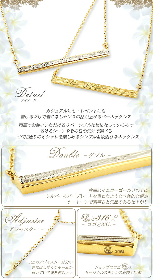 | 商品名 | ハワイアンジュエリー ネックレス ステンレス 金属アレルギー対応 サージカルステンレス リバーシブル バータイプ スティック プルメリア スクロール あずきチェーン付 イエローゴールド メンズ レディース ハワイアン クリスマス ホワイトデー 母の日 などのプレゼントにも |
