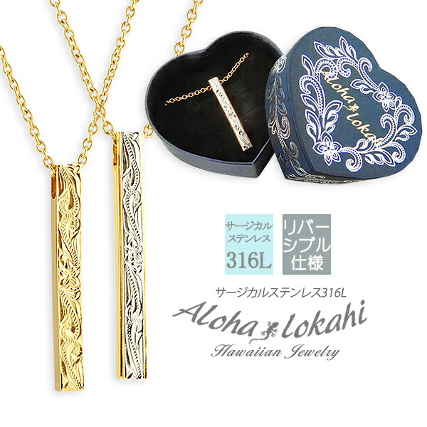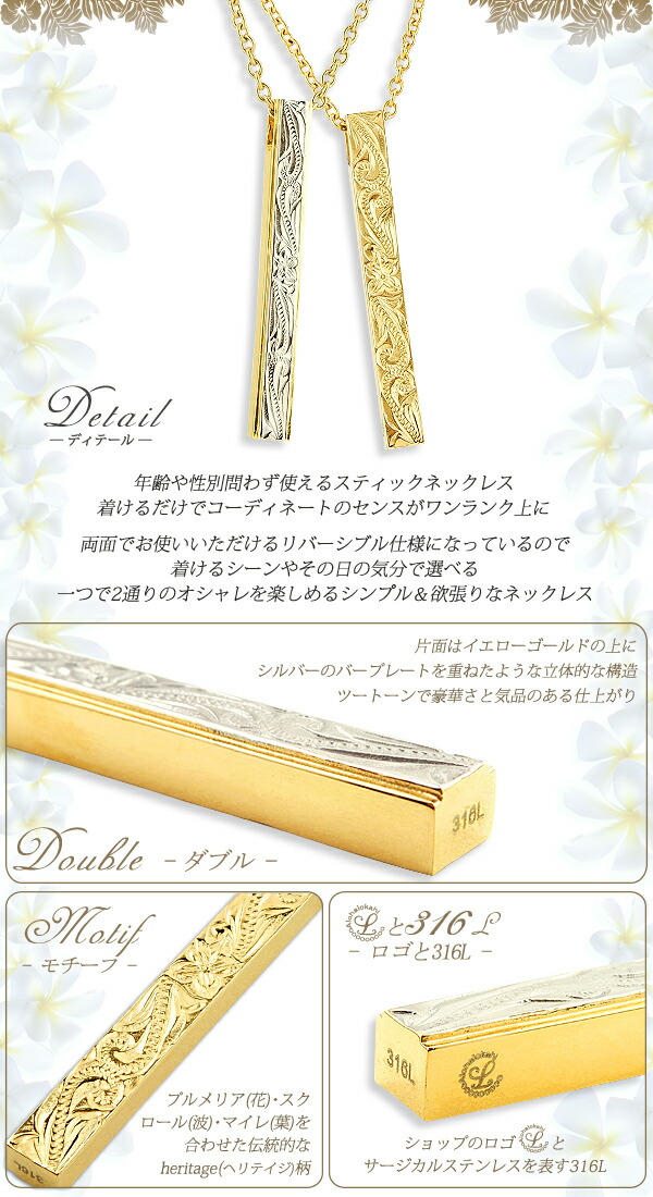 ハワイアンジュエリー ネックレス ステンレス 金属アレルギー対応 サージカルステンレス リバーシブル 刻印 スティック スクロール プルメリア イエローゴールド ハワイアン つけっぱなし 錆びない バレンタイン