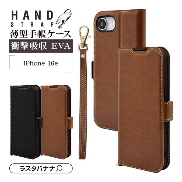 iPhone 16e ケース カバー 手帳型 薄型 耐衝撃吸収 カード入れ スタンド機能 ハンドストラップ付き slim Fit レザー調 アイフォン スマホケース ラスタバナナ