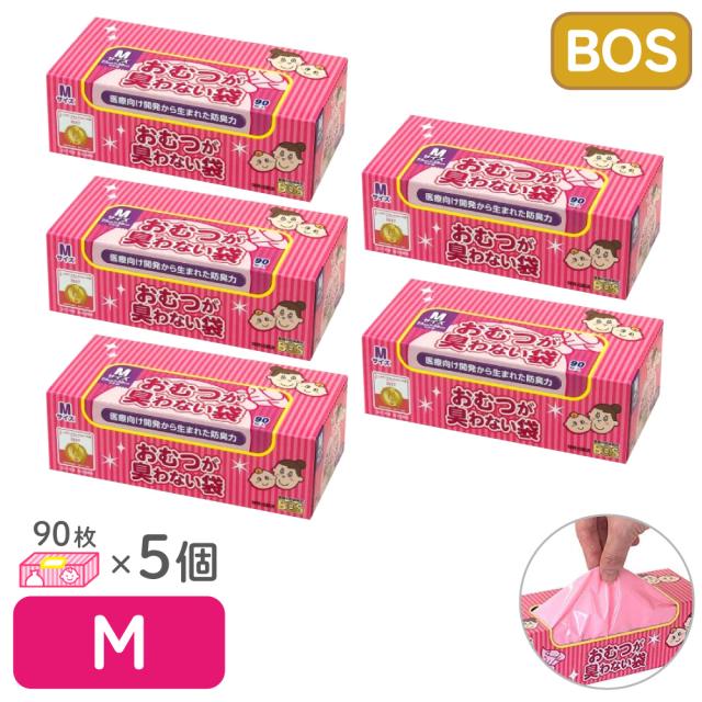 驚異の防臭袋 BOS ボス おむつが臭わない袋 ベビー用 赤ちゃん用 うんち おむつ 袋 消臭袋 処理袋 トイレ袋 うんち袋 エチケット 車 散歩 お出かけ マナー オムツ ゴミ袋 におい対策 生ごみ 介護 マチ付 Mサイズ 90枚入 5個セット