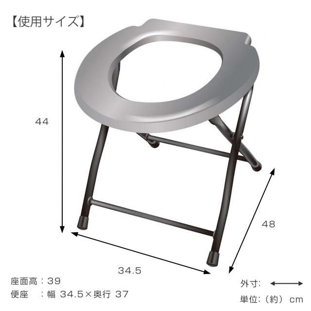 | サイズ | 使用サイズ:約 幅34.5×奥行48×高さ44(cm) 座面高:約 39cm 便座:約 34.5×37(cm) パイプ径:約 1.9cm 折りたたみ時:約 幅34.5×奥行60×高さ7.7(cm) |
