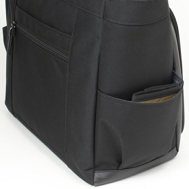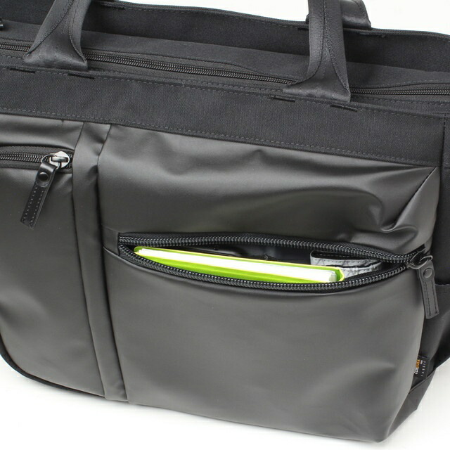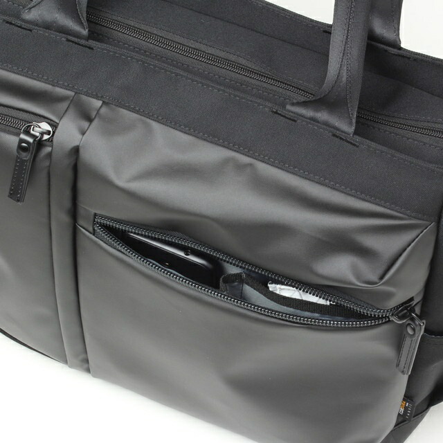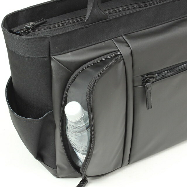 前面左部には内装にPVC生地を使用したファスナーポケットを配置。ドリンクボトルや折りたたみ傘などの濡れ物を収納するのに便利です。