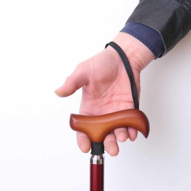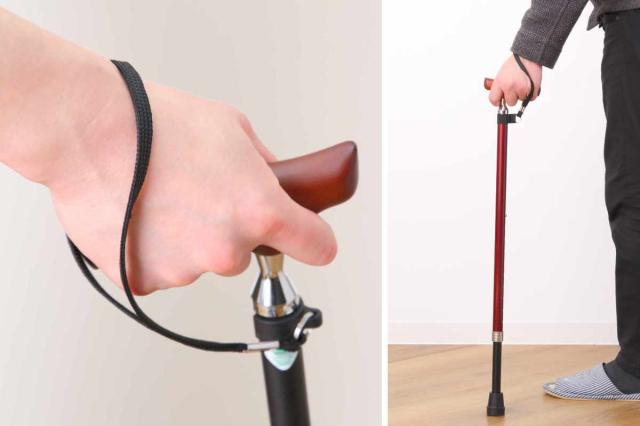 腕とステッキが一直線になるように持ってください。グリップの一部だけを握ると不安定になり危険です。