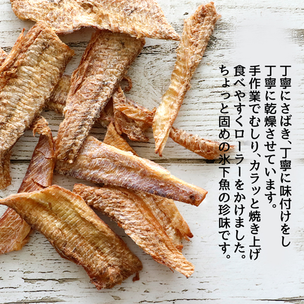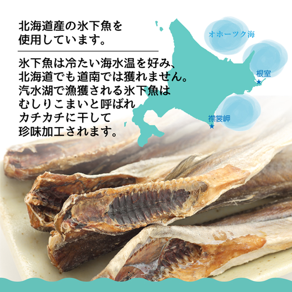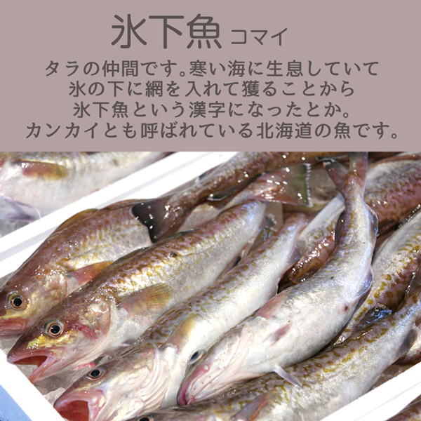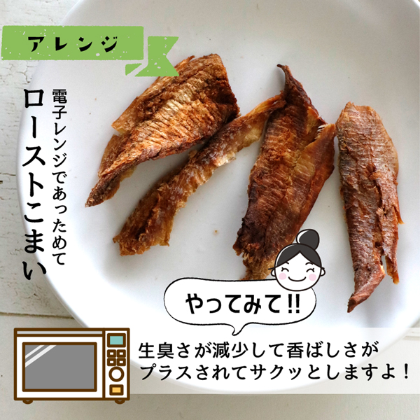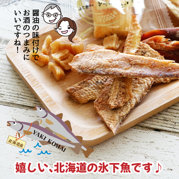 原材料名 :こまい(北海道産)、醤油、砂糖・異性化液糖、米発酵調味料、食塩、還元水飴、食物たん白加水分解物、魚介エキス/調味料(アミノ酸等)、ソルビット、増粘多糖類、(一部に小麦・大豆を含む)