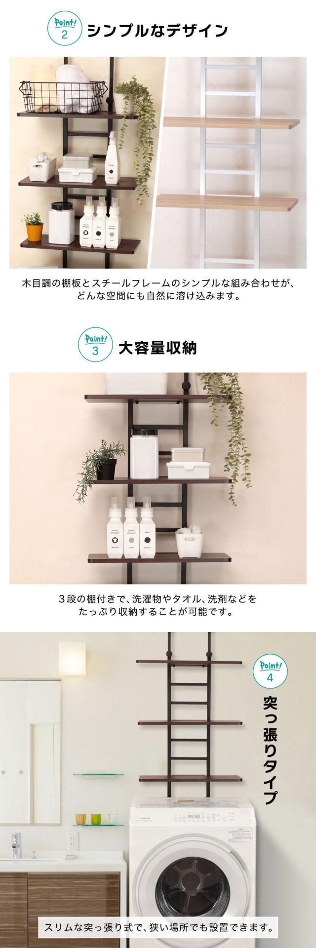 3段の棚付きで、洗濯物やタオル、洗剤などをたっぷり収納することが可能です。