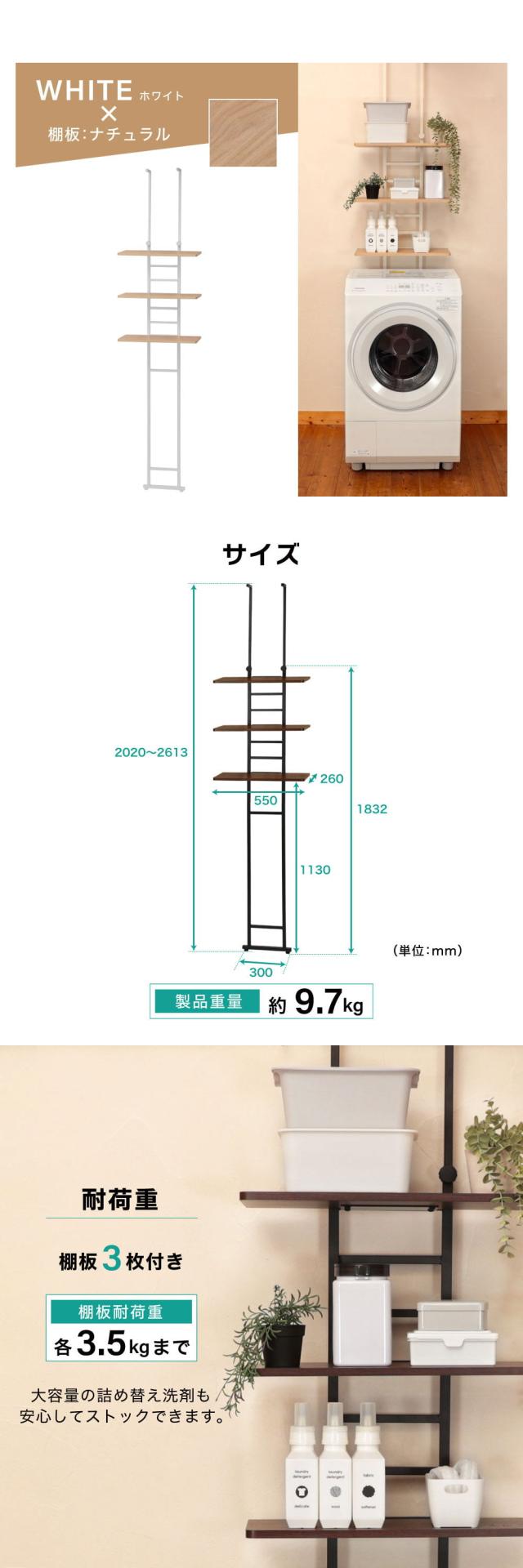 【期間限定ポイント5倍 4/20 10時まで】 ランドリーラック 棚3段 幅55 奥行26 高さ202~261 突っ張り 3段 洗濯機 ラック 収納棚 おしゃれ 伸縮 洗濯機収納 収納 洗濯物 脱衣所 洗面所 洗濯機 ホワイト 白 MWR-CS03 マクスゼン