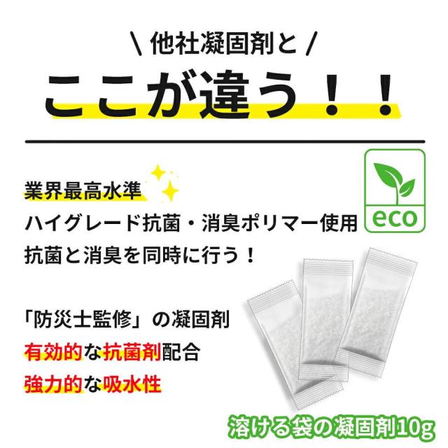 | 特徴 | もしものときに、すぐに使える! 安心・便利な携帯トイレ 4個セット 開口部が柔らかい素材のため、ストレスなく使えます。 開口部はジッパー構造になっているので、こぼれる心配がありません。 凝固剤の最大吸水量は700mlなので、安心してお使いいただけます。 ●溶ける袋の凝固剤10g、しっかり固まり ●すぐに固まり、こぼれない ●吸収量700mlの大容量 ●抗菌・消臭 ●男女兼用 ●15年長期保存可能 |