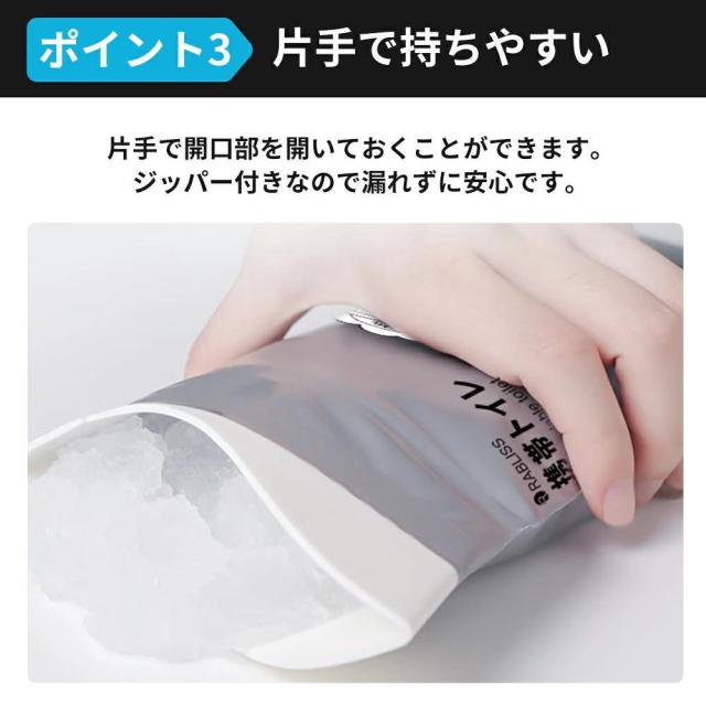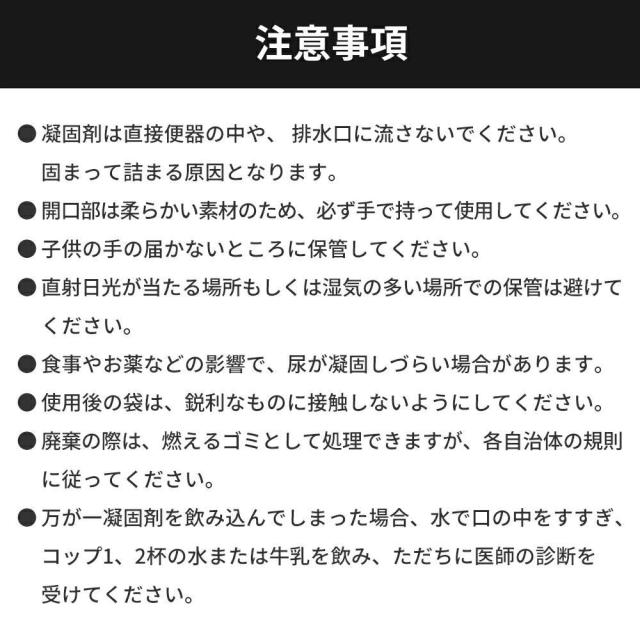 | 注意事項 | ●凝固剤は直接便器の中や、 排水口に流さないでください。 固まって詰まる原因となります。 ●開口部は柔らかい素材のため、必ず手で持って使用してください。 ●子供の手の届かないところに保管してください。 ●直射日光が当たる場所もしくは湿気の多い場所での保管は避けてください。 ●食事やお薬などの影響で、尿が凝固しづらい場合があります。 ●使用後の袋は、鋭利なものに接触しないようにしてください。 ●廃棄の際は、燃えるゴミとして処理できますが、 各自治体の規則に従ってください。 ●万が一凝固剤を飲み込んでしまった場合、水で口の中をすすぎ、 コップ1、2杯の水または牛乳を飲み、ただちに医師の診断を受けてください。 |
