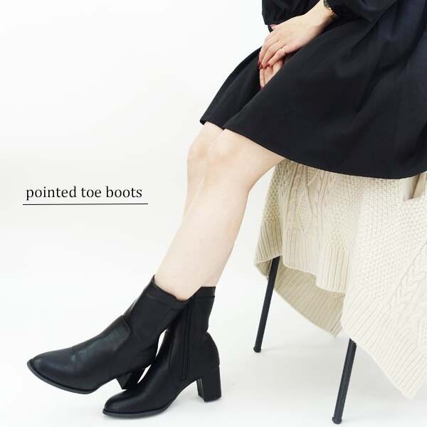 筒回りがすっきり見えるデザインに仕上げたミドル丈のポインテッドトゥブーツ。