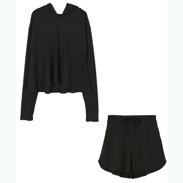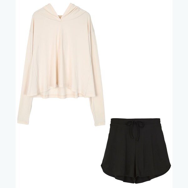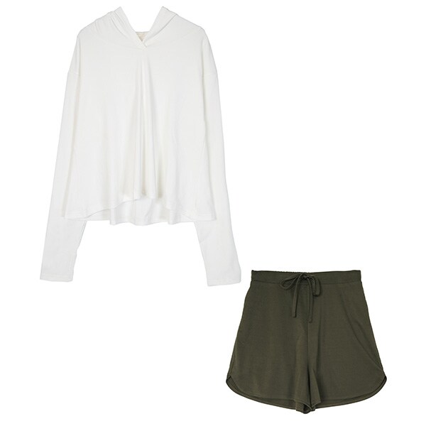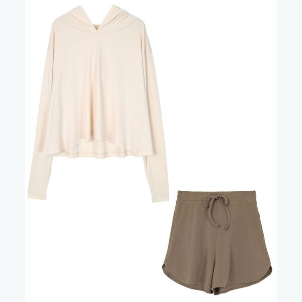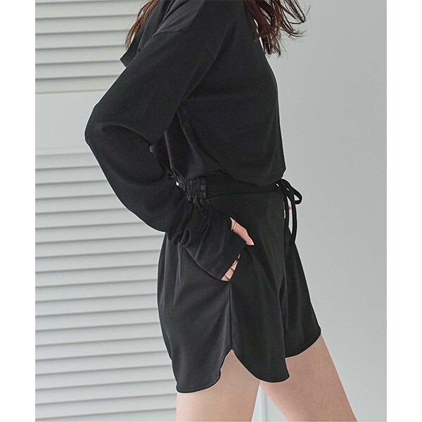 ・トップスのフレアデザインが大人可愛い長袖ラッシュガードとショートパンツのセットアップ。