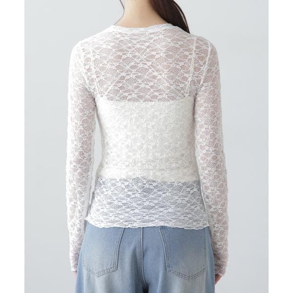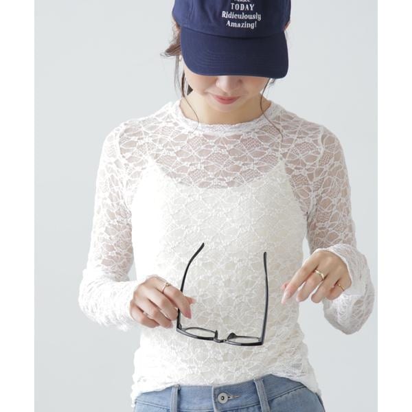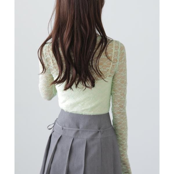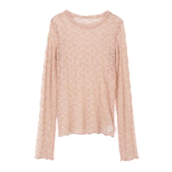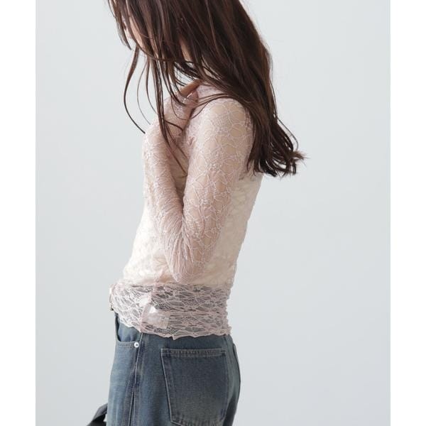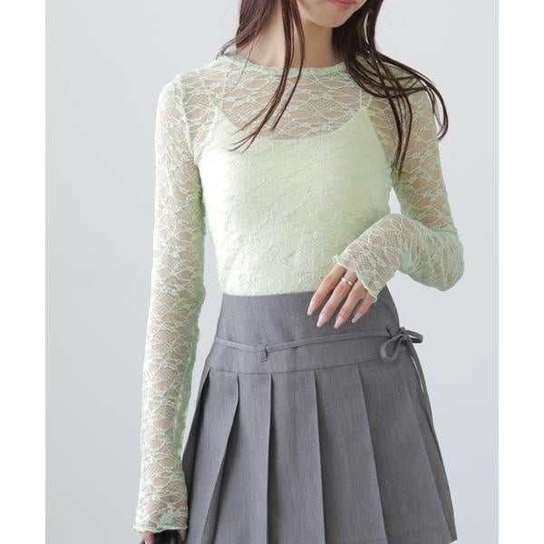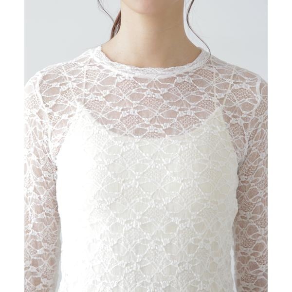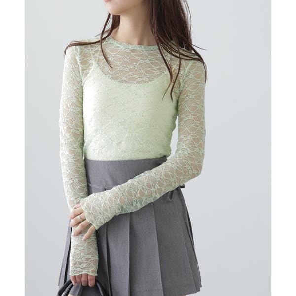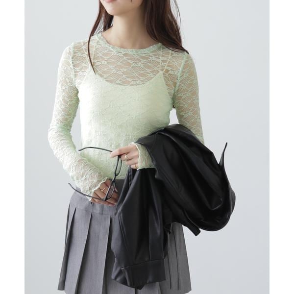 ご好評いただいたレーストップスが、着丈などを見直しアップデート。コンパクトなサイズ感が可愛いレーストップスです。凹凸のあるレースを使用しているので、のっぺりして見えず表面感があります。袖口・裾はメロー仕様でさりげなく抜け感を出しています。ベーシックな#010ブラックと#030ホワイト、人気の#090ピンクに加えて、新色#130ライトグリーンが仲間入り。サイズがコンパクトなので、ダボっとしたデニムやスラックスと合わせるのがおすすめです。レースアイテムは華やかな印象に見せてくれるので、一枚着としては勿論、インナーとしても着回せるのがポイントです。※モデルの着用画像の場合、光の当たり具合により、実際の色味と異なって見えることがございます。色味は、商品単体の画像をご参照ください。