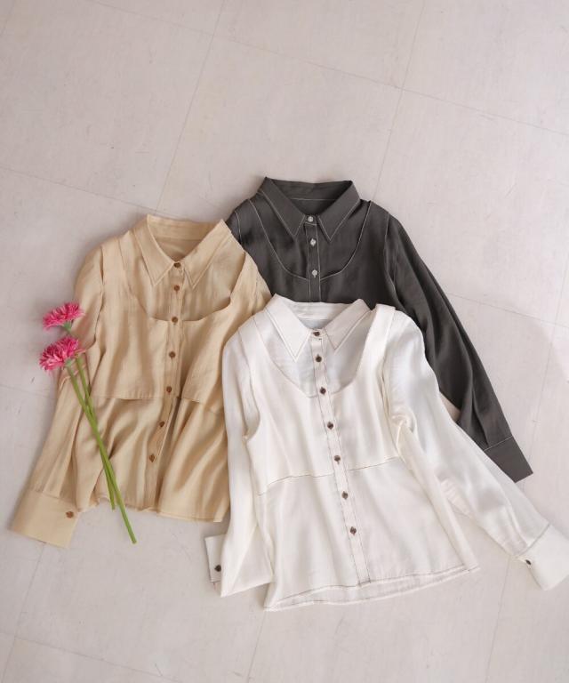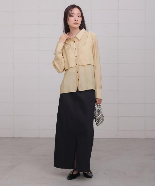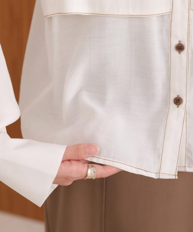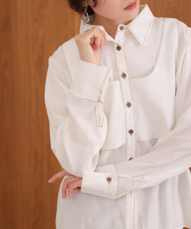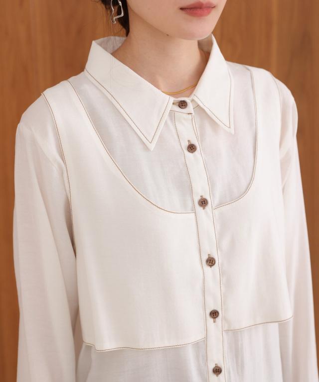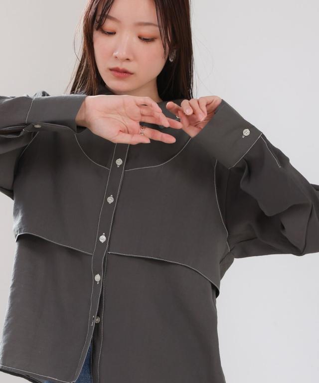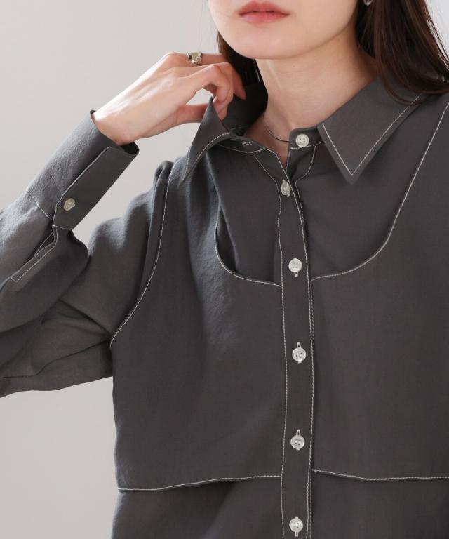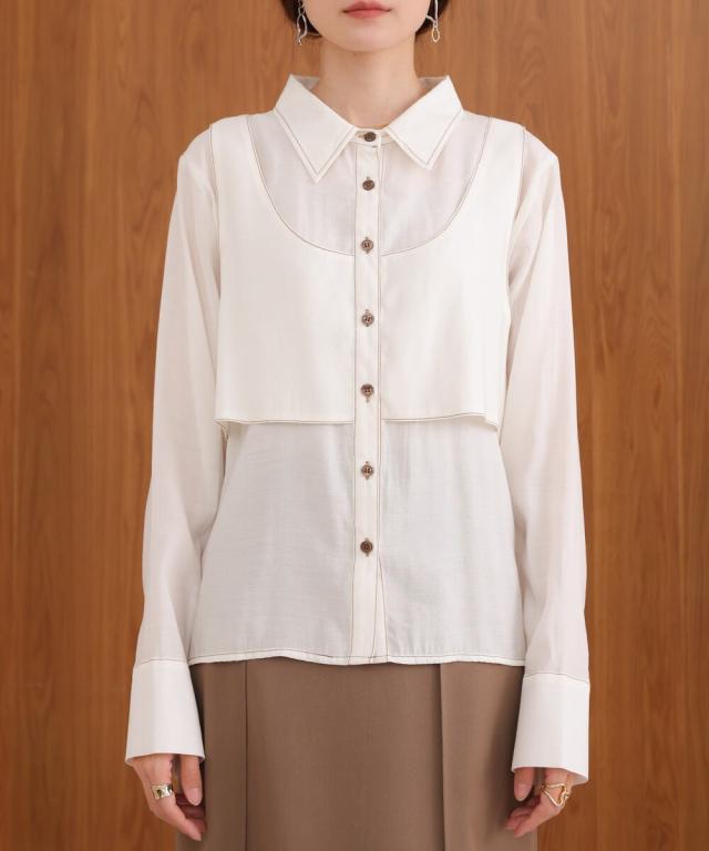 シンプルなキレイめシャツにビスチェをレイヤードしたような、ひと癖デザインをお楽しみ頂けるBabらしいアイテムが新登場です。エッジの効いた配色ステッチやボタンがコーディネート全体にメリハリをつけます。レイヤードになっているのはフロントだけなので後ろはベーシックなヨーク切替のすっきりしたアイテムに仕上げています。