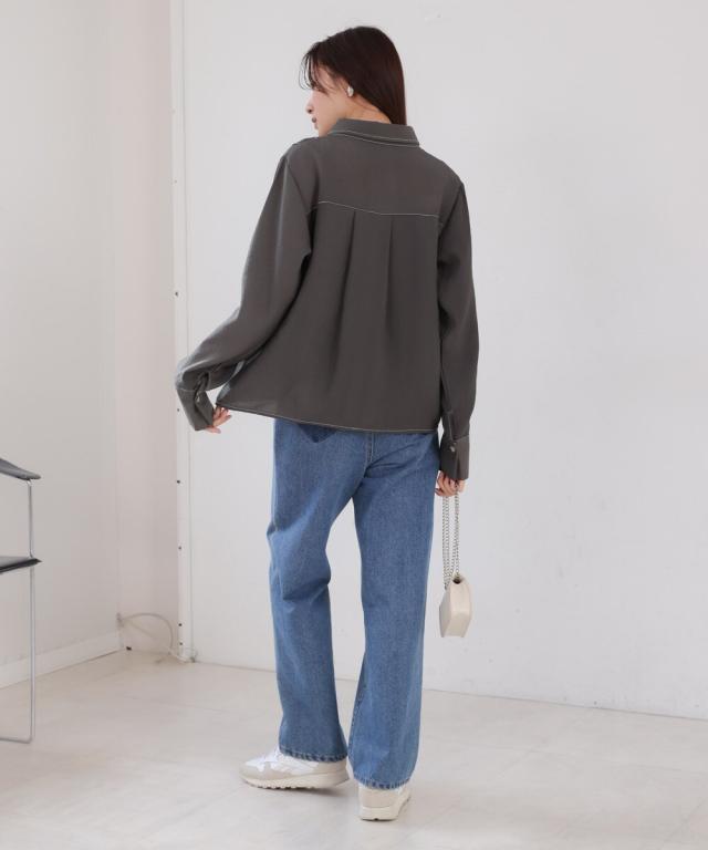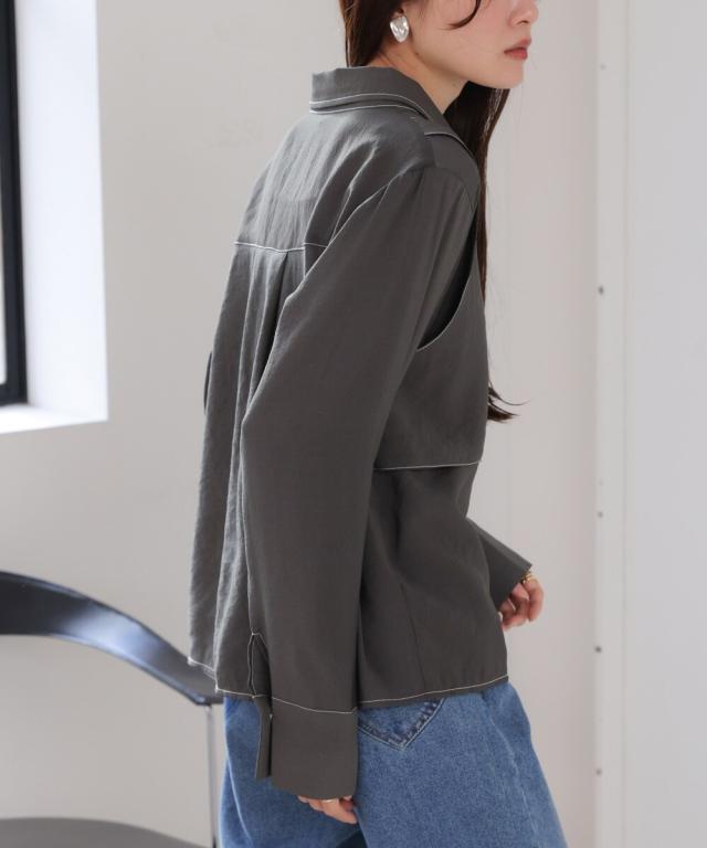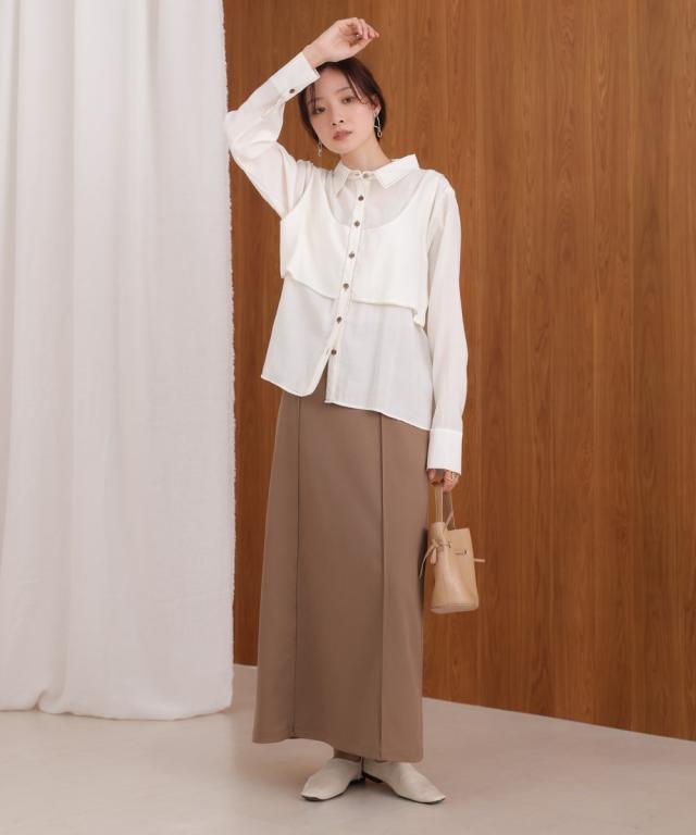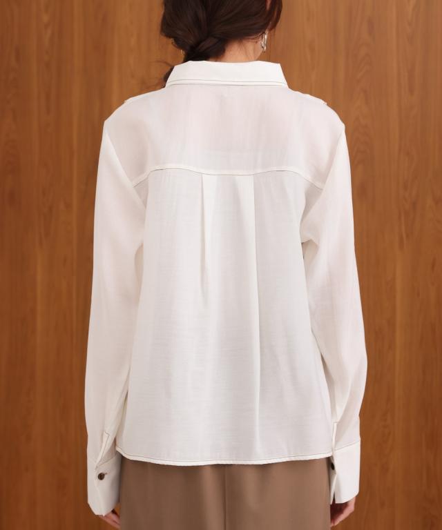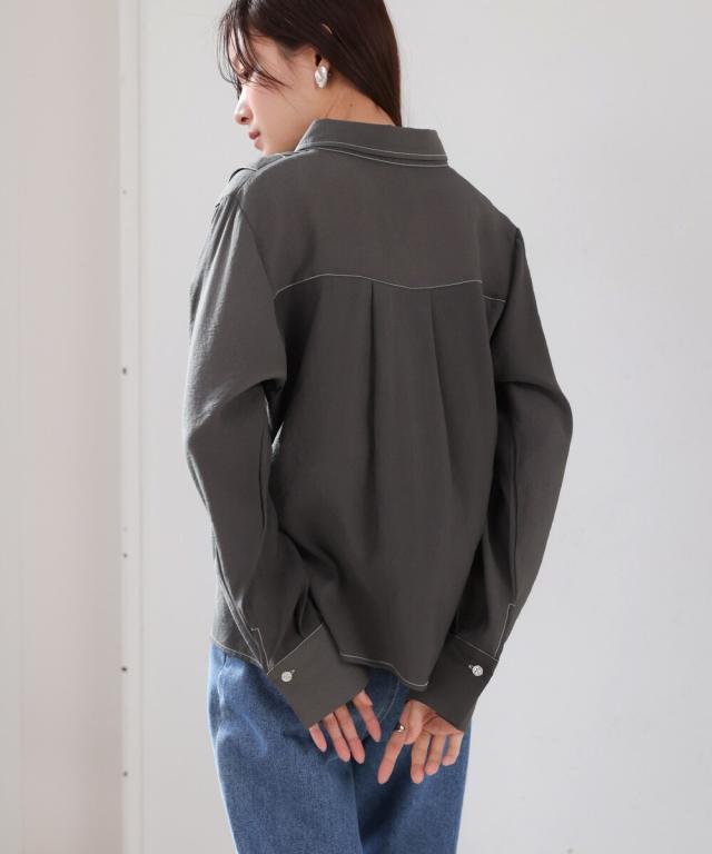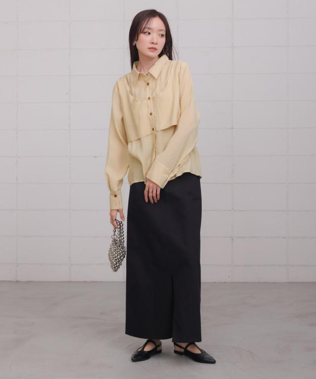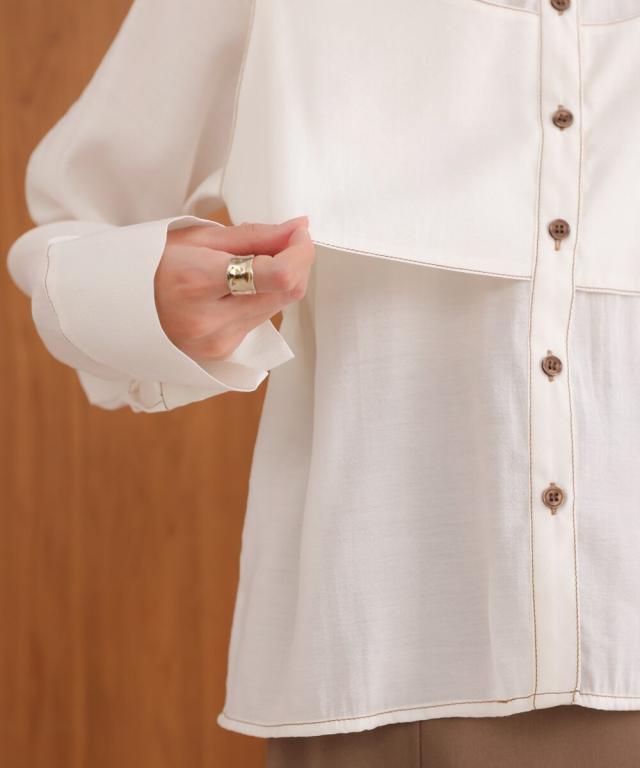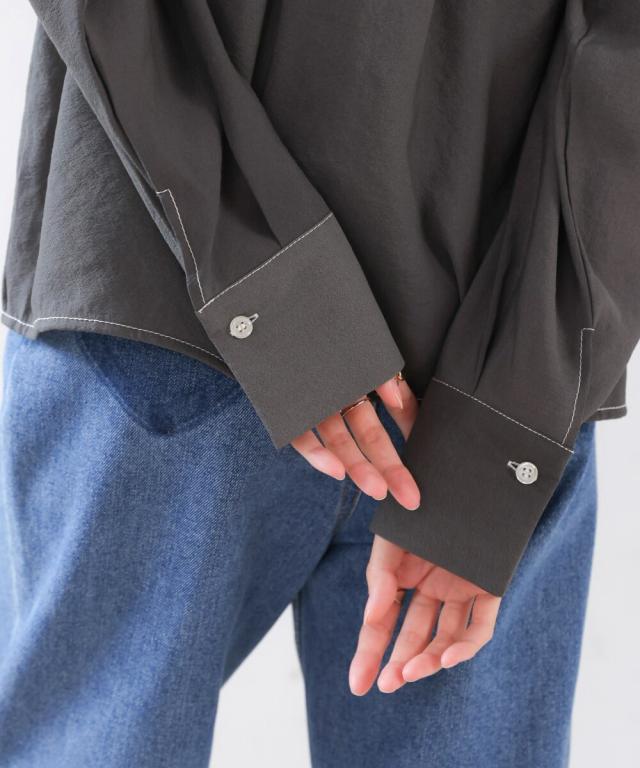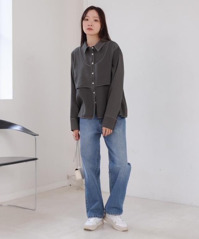 シンプルなキレイめシャツにビスチェをレイヤードしたような、ひと癖デザインをお楽しみ頂けるBabらしいアイテムが新登場です。エッジの効いた配色ステッチやボタンがコーディネート全体にメリハリをつけます。レイヤードになっているのはフロントだけなので後ろはベーシックなヨーク切替のすっきりしたアイテムに仕上げています。