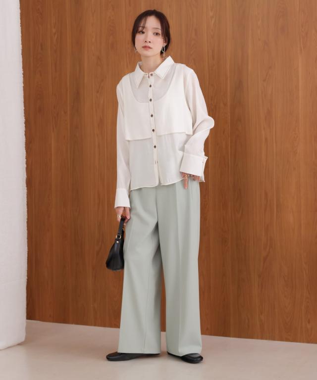 フロントにポイントがあるのでボトムはシンプルにワイドパンツやスラックス合わせがおすすめ◎もちろんスカートにも合うのでタイトスカートなどブラウスの裾をインして綺麗めコーデにも仕上がります。