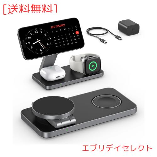 KEEPRO ワイヤレス充電器 3in1 折り畳み式 Magsafe充電器 Qi急速充電 同時に3つのデバイス充電 15W/10W/7.5W マルチ充電スタンド マグセ
