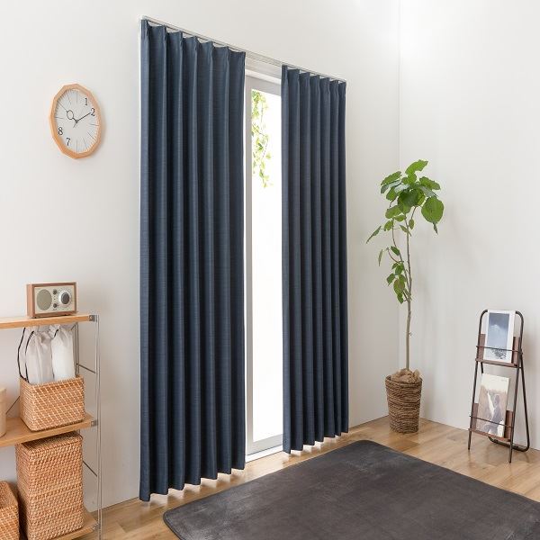 ネイビーとベージュの2配色展開。ネイビーは2級遮光、ベージュは3級遮光の遮光機能が付いたドレープカーテンです。生地はしっかりとした厚みがあります。お部屋が暗くなりすぎず光を程よく取り込めます。ウェーブを綺麗に保つ“形状記憶加工”を施しており、洗濯しても型崩れしません。 同色のタッセルと アジャスターフック(Aフック)が付属されております。