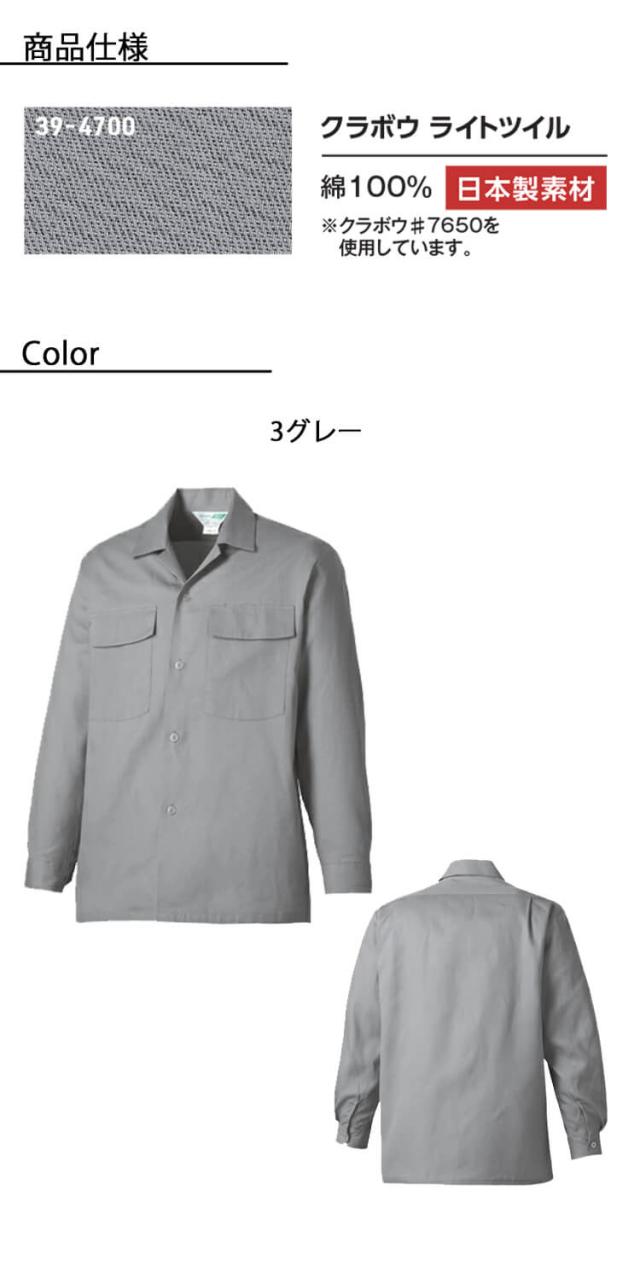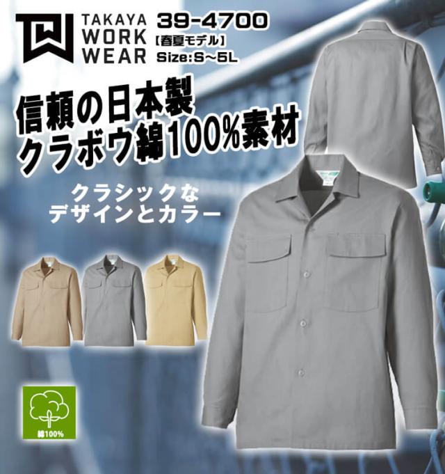 タカヤ商事 タカヤワークウェア 長袖オープンシャツ 39-4700 春夏 サイズS〜LL 綿100% 作業服 15-6070シリーズ