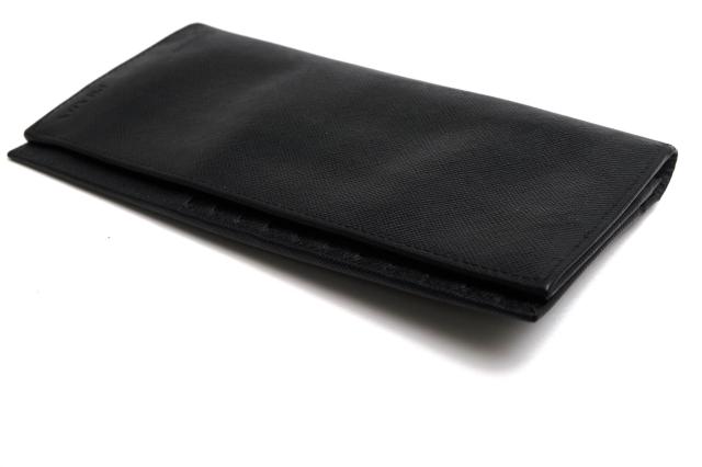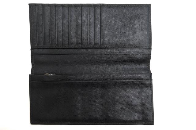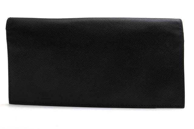 プラダ定番のサフィアーノレザーに、ブランドロゴが片押しされたシンプルなロングウォレット。型押し仕上げのサフィアーノレザーは傷に強く、高級感があります。2つ折りタイプで収納力があり、使いやすさも抜群。ビジネスユースにも最適です。