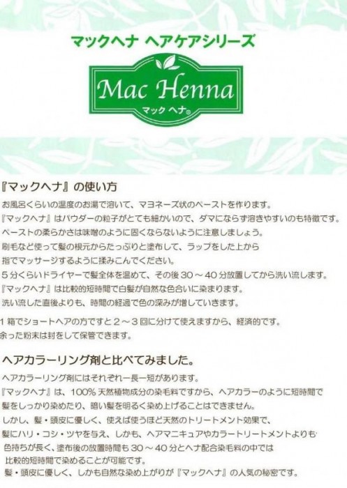 | マックヘナの人気商品「ナチュラルダークブラウン」のパウダー2のインディゴです。「ナチュラルダークブラウン」のパウダー1だけが余ってしまう方にオススメ!※単独でご使用になられると白髪は藍色になります。 【マックヘナパウダー使用量のめやす】 ●ショートヘア:30g前後 ●セミロング:60g前後 ※ヘナ60gに対し、お湯約200cc 【ご用意いただくもの】 ボウル(パウダーを溶くため)、スプーンなど(かき混ぜるため)、ハケなど(ペーストを髪に塗るため)、ラップ(塗布後頭皮を包むため)、コールドクリーム(フェイスラインの色つき防止)、ケープや古タオル(衣類の汚れを防ぐため) 【ご使用上前の注意】 ●植物アレルギーのある方や、過去にアレルギーを起こしたことのある方、また体質の変化によりお肌に合わない場合がありますので、事前に必ずパッチテストを行ってからご使用ください。過去に染毛剤(ヘアカラー)でかぶれたことのある方は特に注意してください。 ●妊娠中や体調不良などの時には、特にお肌が敏感になっておりますので、ご使用する前には専門医にご相談ください。また、頭皮に傷のある方はご使用をお避け下さい。 【取扱・保管上の注意】 ●ご使用の際には付属の手袋を着用し、耳の裏やフェイスラインにコールドクリームを塗り、顔や肌への付着を予防してください。付着した場合は、早めに拭き取るか洗えば色は付きません。 ●使用後3〜4日間は若干色落ちすることがあります。衣類などにつきますと落ちにくいことがありますのでご注意ください。 ●保存する際は、直射日光や高温を避けてください。開封後は密閉しなるべく3ヵ月以内にご使用ください。 ●誤飲防止のため、お子様の手の届かない場所に保管してください。 ●マックヘナペーストが浴室・浴槽・洗面台に付いて長時間放置してしまうと着色が落ちづらい恐れがありますので、すぐにシャワー等で(場合によっては浴室用洗剤等を使用して)洗い流してください。 |
