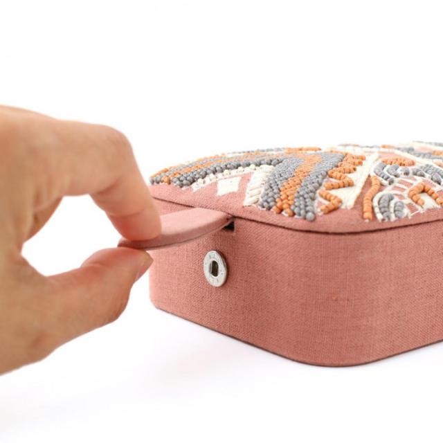 商品詳細:エスニック調でパステルカラーのビーズ刺繍小物入れ。雑多になりがちなネックレスや腕時計などのアクセサリーを入れたり、ギフトボックスとしてもおすすめ。 生産国:インド 素材・材質:コットン・ビーズ・MDF 商品サイズ:約11×16×H5cm
