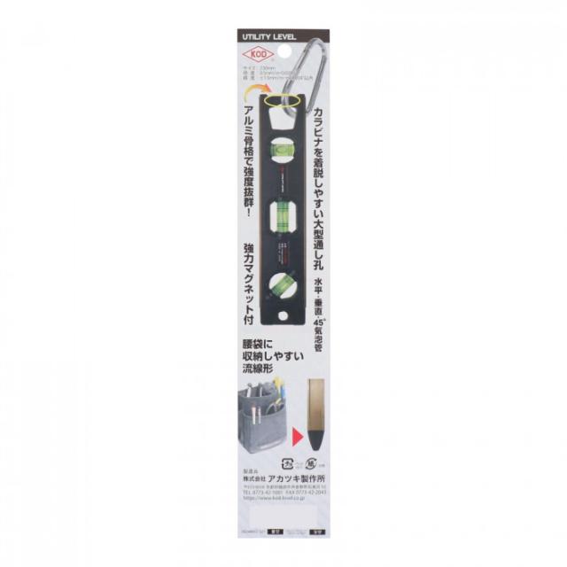 商品詳細:230mm・水平・垂直・45度気泡管付水平器。職人~DIYと幅広いユーザーに使用されています。カラビナを着脱しやすい大型通し孔。 生産国:日本 商品サイズ:H45×W230×D16mm 重量:150g 仕様:気泡管感度:0.5mm/m:0.0286度精度:±1.5mm/m:±0.0859度以内