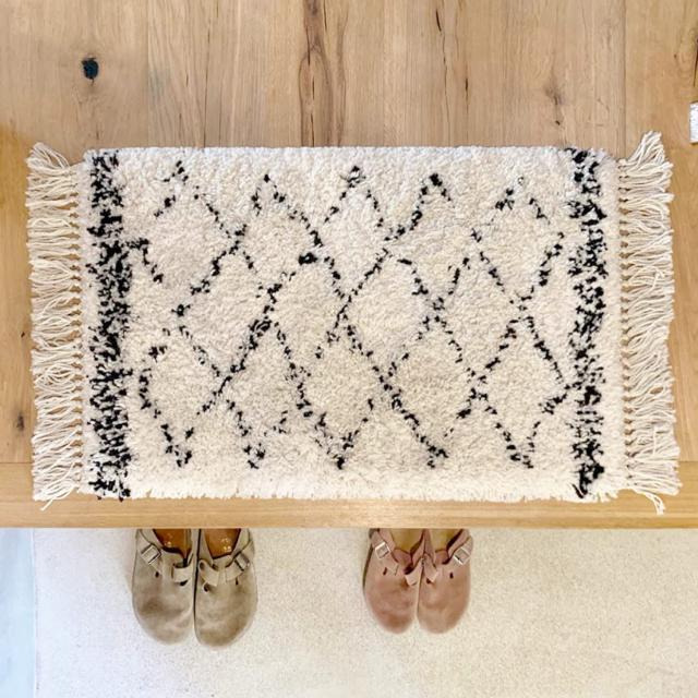 人気のベニワレン風マット。パイル長約35mmのふっくらボリュームのあるシャギーマットで至福の時を。アイボリーにブラックの大柄チェックでおしゃれなデザイン。落ち着いた色合いはモノトーンインテリアやシャービーな雰囲気のおうちにぴったり。インスタ映え間違いなし。