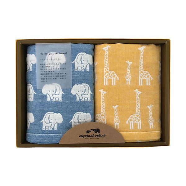 柔らかなガーゼ素材で作られた、フェイスタオル2枚セット 大きさは約34×80cmで、エレファントと赤ちゃんのイラストが描かれています 柔らかなガーゼ素材で作られた、フェイスタオル2枚セット 大きさは約34×80cmで、エレファントと赤ちゃんのイラストが描かれています