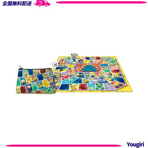 ミニオンズがデザインされたかわいいポーチに、ゲームボードとフィギュアのコマ、サイコロがセットになった、持ち運んで遊べるゲームアイテムです。