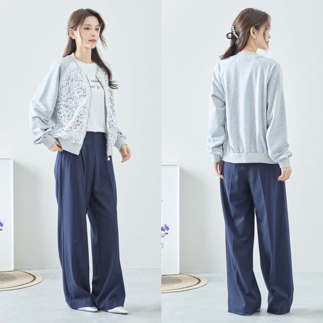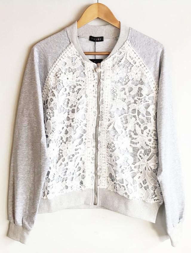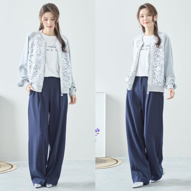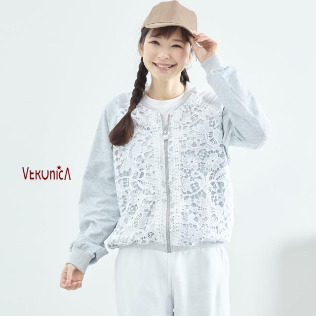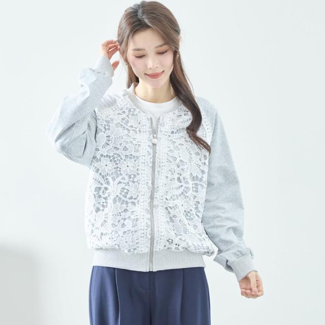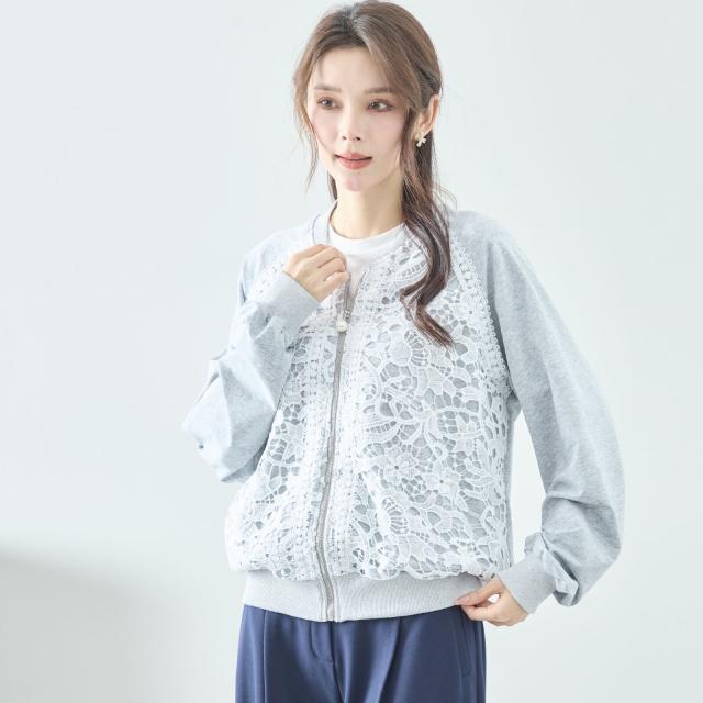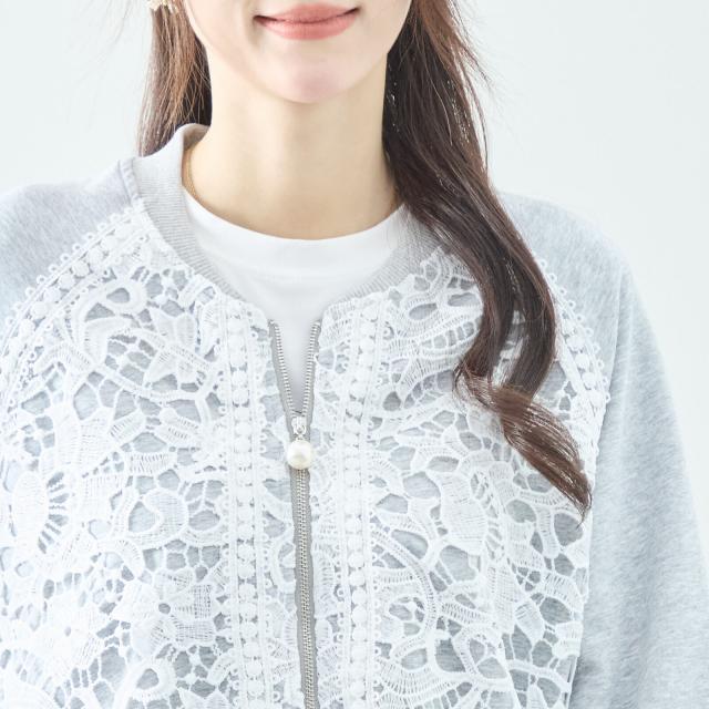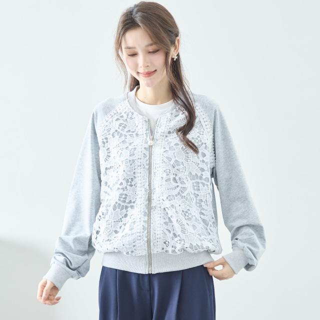 春夏のはおりものとして大活躍するライトブルゾン。花柄切替レースデザインでスポーティーなスタイルの中にも可愛さがUPします。