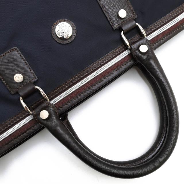 3層構造で設計された大容量のブリーフケース。メイン素材には、イタリア・リモンタ社の高密度ナイロンを使用。イタリア ミラノのあるロンバルディア州にて創業した100年以上の歴史あるテキスタイルメーカーで、ラグジュアリーブランドでも使用されていることでも有名。軽量でありながらも、しなやかで程よい光沢感があり、上品な印象です。豊富な収納スペースが特徴で、複数のポケットとペン差しを装備しています。背面に配されたファスナーを開くことでキャリーバッグにセットアップできます。