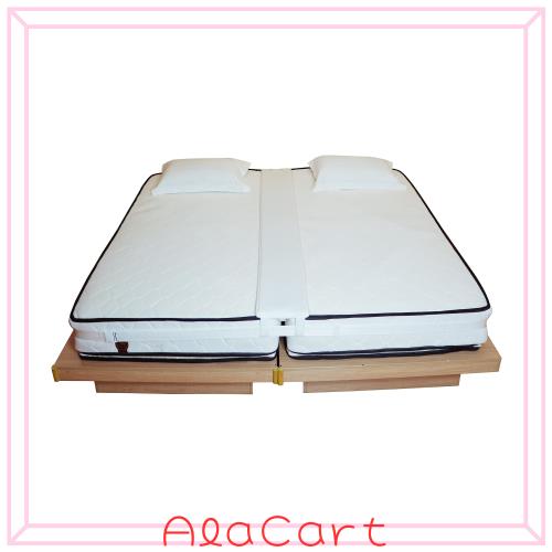 【隙間パッド+連結ベルト】2つのマットレスの中央部分にピッタリ納まるすきまパッドと、マットレスのズレを防ぐ連結ベルトのセットです。固定ベルトをマットレス全体に一周させることで、マットレス同士のズレを防ぐことができます。