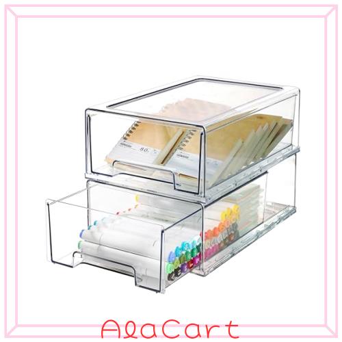 2つのプラスチックスタッキング収納引き出し 幅32×奥行21×高さ11cm、透明デスク引き出し収納器、2引き出し収納器、引き出し付き化粧収