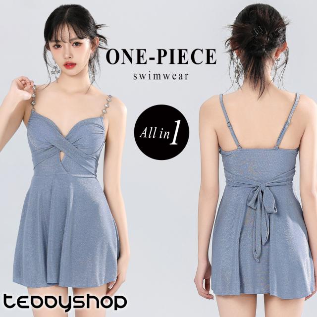 水着 レディース 体型カバー ワンピース オールインワン フレア ラメ リボン カットアウト ビジュー カシュクール クロスデザイン 肩紐 ストラップ Aライン メロウフリル カップ付き ワイヤーあり 胸 盛れる ヒップ 太もも お尻 脚 カバーアップ
