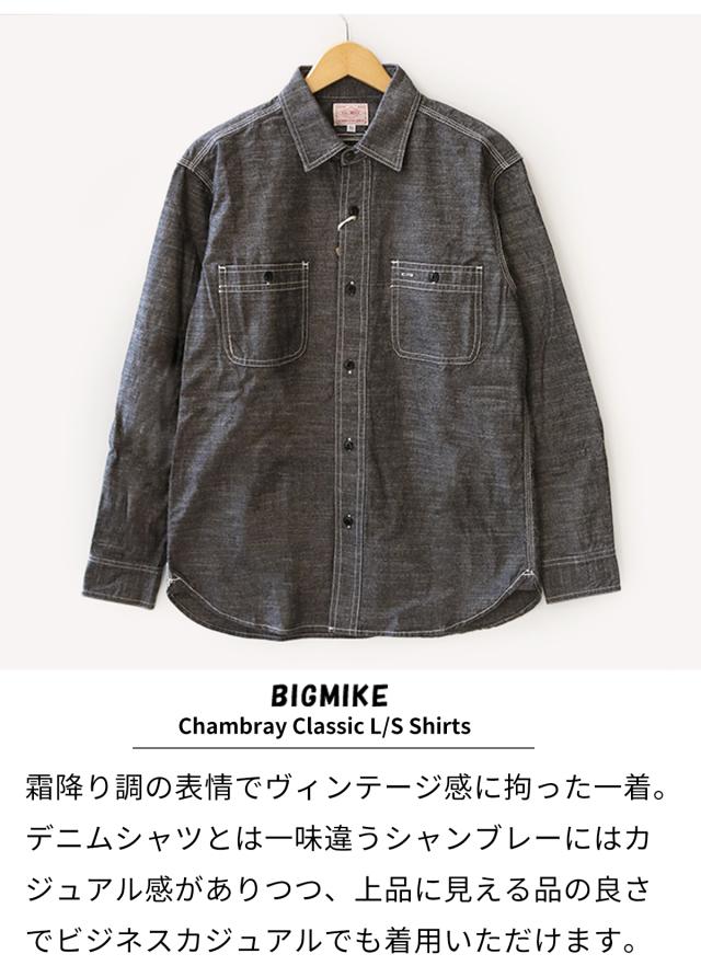 BIGMIKE ビッグマイク 長袖シャツ シャンブレー クラシック L/Sシャツ シャンブレーシャツ デニムシャツ シャツ メンズ レギュラーシルエット ブラック M L XL ビジネスカジュアル セミフォーマル カジュアル アメカジ 大人カジュアル ブランド びっぐまいく 男性 かっこいい 10代 20代 30代 40代 50代
