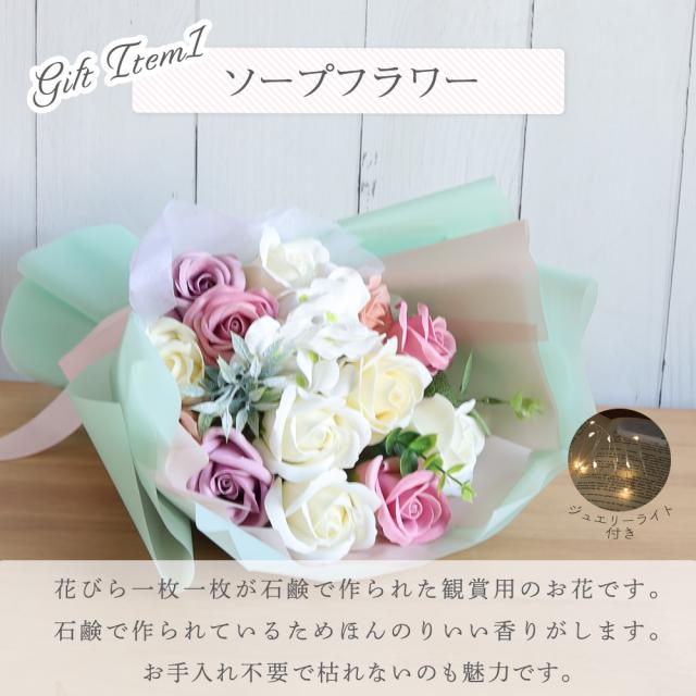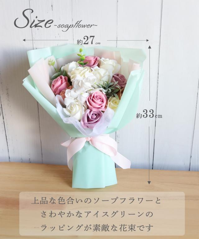 当店オリジナルのソープフラワーはかわいらしい色合いの花にさわやかな雰囲気のラッピングを施した上品なデザインが特徴です。
