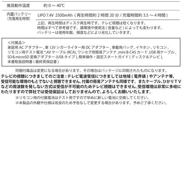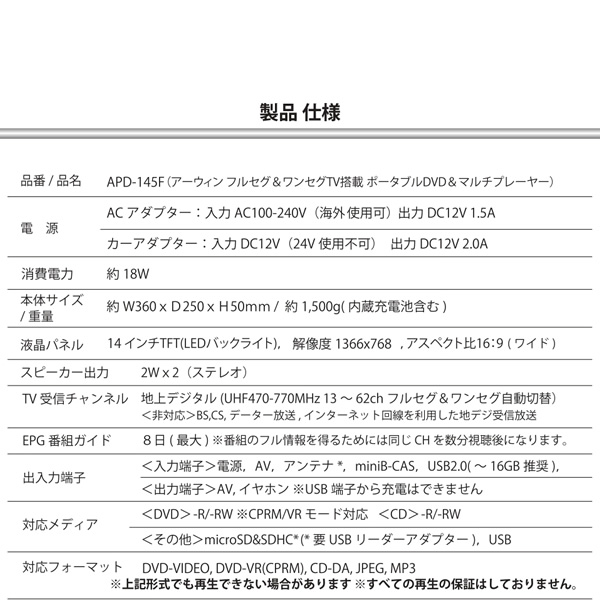 大画面14インチ・ダブルTVチューナー搭載ポータブルDVD&マルチプレーヤー APD-145F ・フルセグ&ワンセグTV搭載 ・家でも車でも楽しめる3電源対応モデル ・昔の名画等の画面比4:3、上下・左右 CUT なしで再生 ・パソコンいらず!音楽CDを USB・SD に簡単コピー機能 ■本体サイズ / 重量 約W360×D250×H50mm / 約1,500g (内蔵充電池含む) ■テレビの視聴につきましてのご注意 テレビ電波受信につきましては地域(電界値)やアンテナ等、 受信可能な環境のもとでないと視聴できません。付属の簡易アンテナも同様です。またケーブル、ひかりTV などの周波数を発しない方式は受信が不可能のためテレビ視聴はできません。受信環境は非常に多岐にわたりますので弊社では受信保証はしておりませんので、よろしくお願いいたします。 ※記載は商品仕様の一部です。仕様説明不足等の理由での返品はできません。特に適合等は必ずご確認ください。